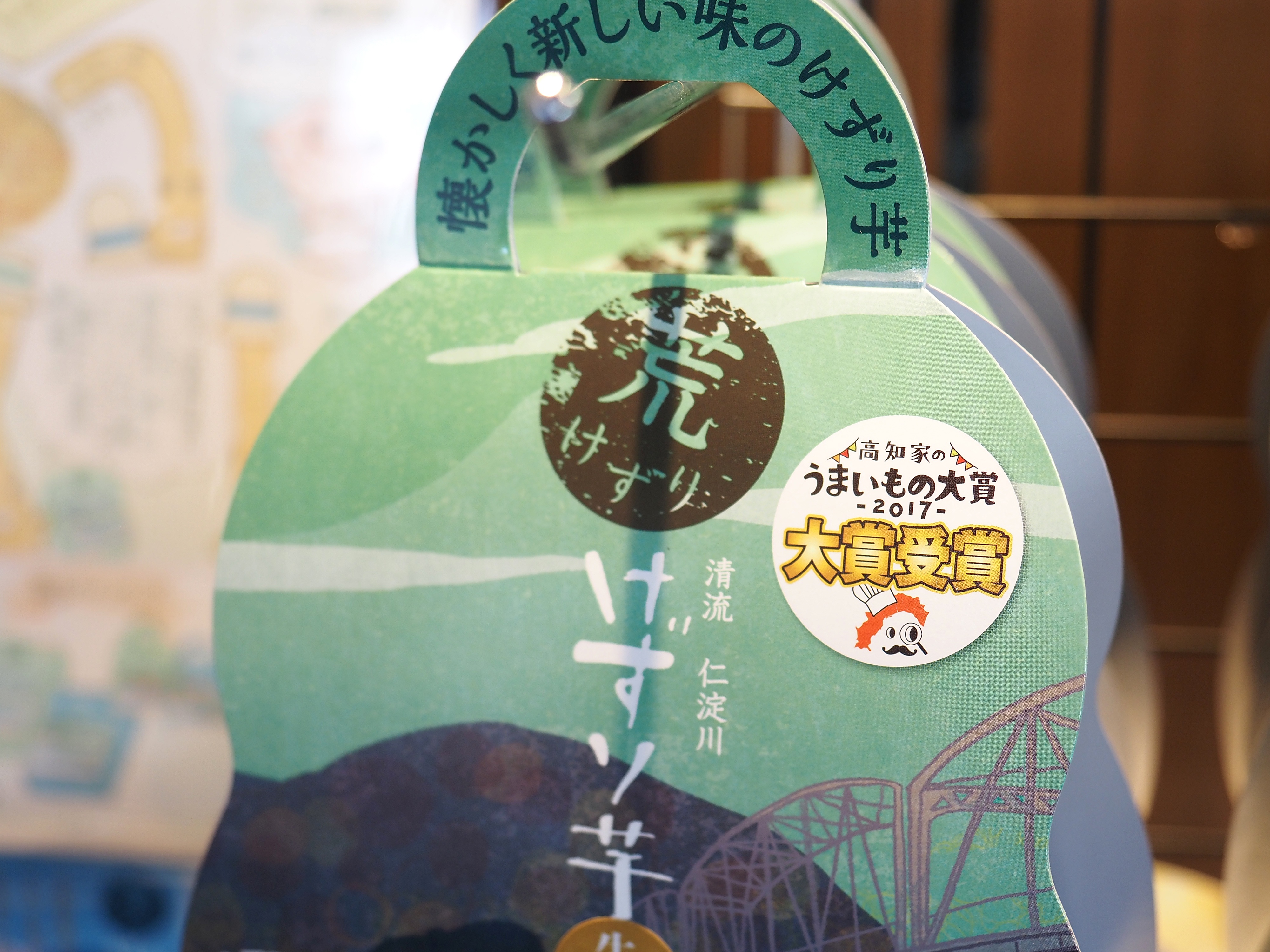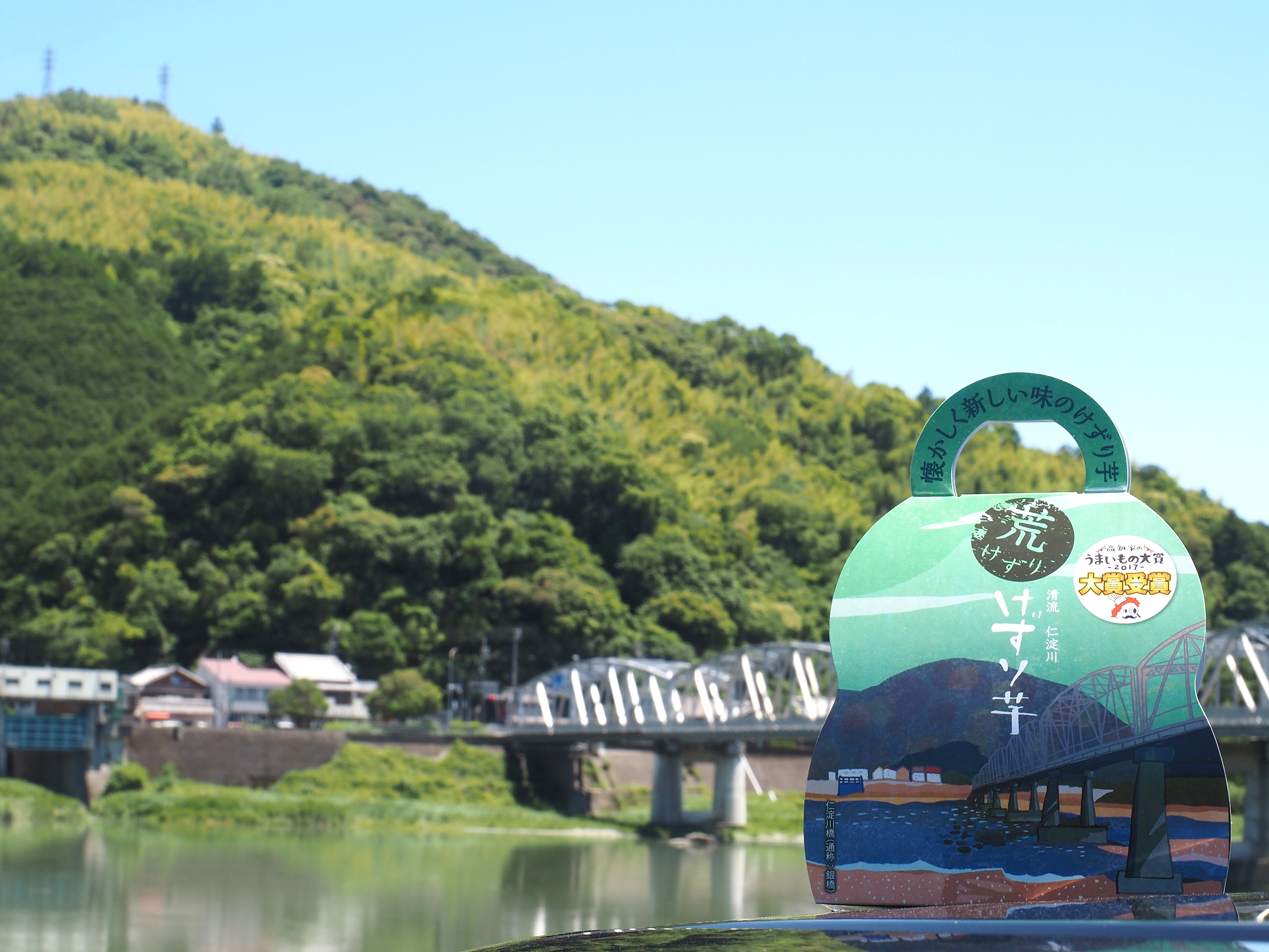 「けずり芋 荒けずり」のパッケージには、お店からそう遠くない場所にあり、近年人気を集める仁淀川のシンボルである「仁淀橋(銀橋)」のイラストを採用しました。