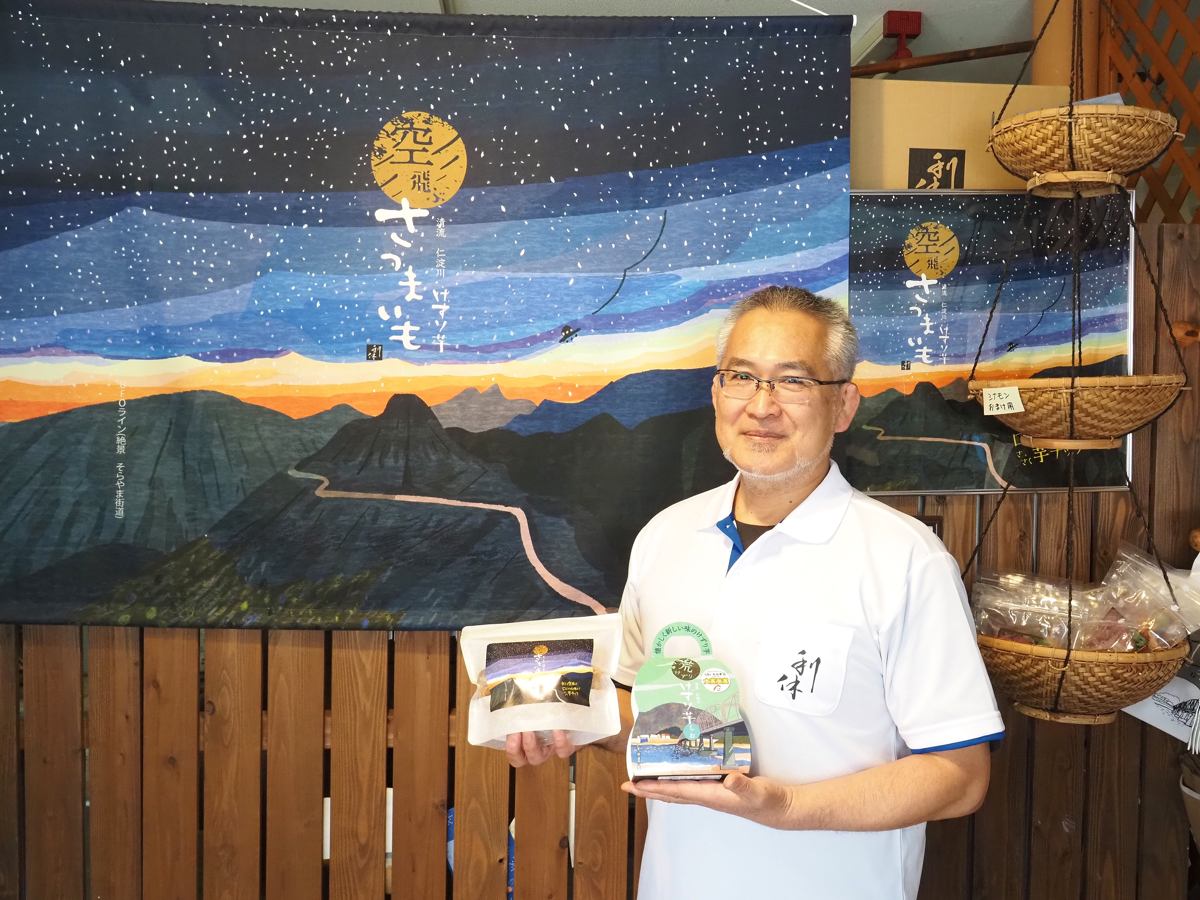 「空飛ぶさつまいも」のパッケージに描かれているイラストは、西日本最高峰の石鎚山を背景に、標高1,300m~1,700mの尾根沿いを縫うように走る町道、通称UFOラインを描いており、珍しく映り込んだUFOが多くの方を癒しています。