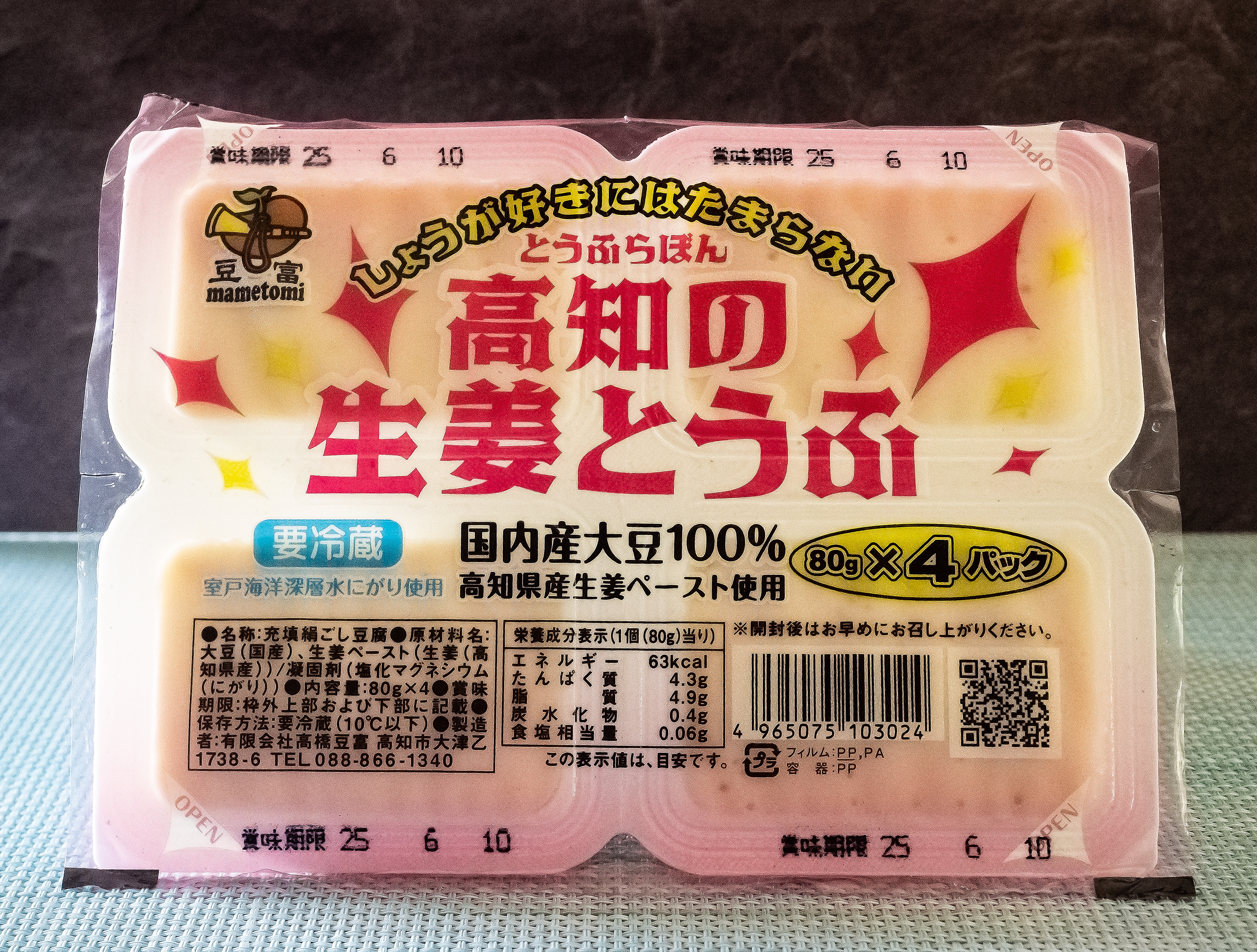 フィルムを剥がすとショウガの香りが広がり、ひと口食べれば豊かな風味が感じられつつ、大豆の濃厚な味もちゃんと楽しめます。「当初はショウガをこんなに入れるつもりではなかったのですが、豆腐自体の味とバランスをとっていたら今ぐらいの量じゃないとおいしさが伝わらないと。最初の4倍ぐらいは使っていますね」と高橋さん。