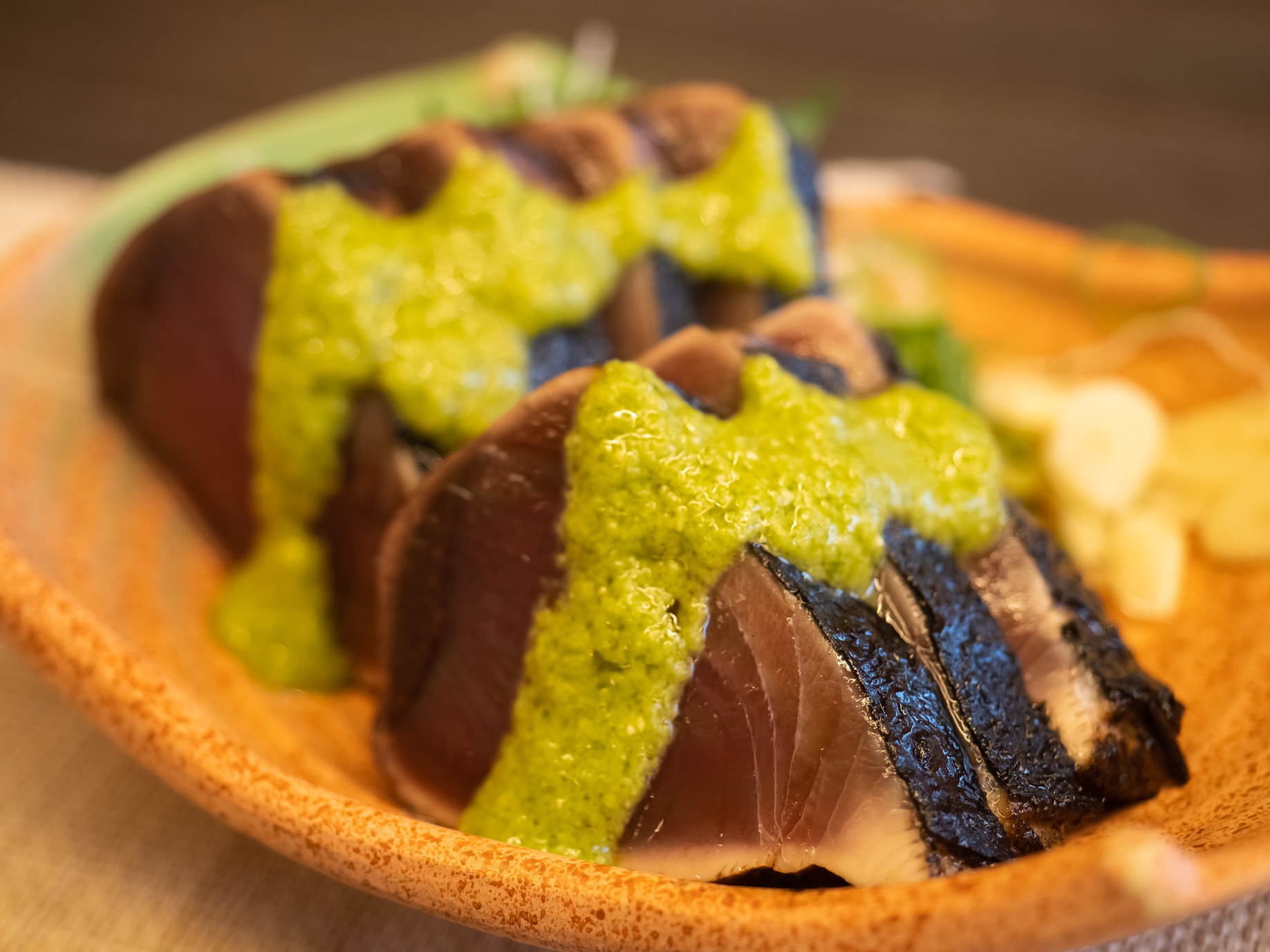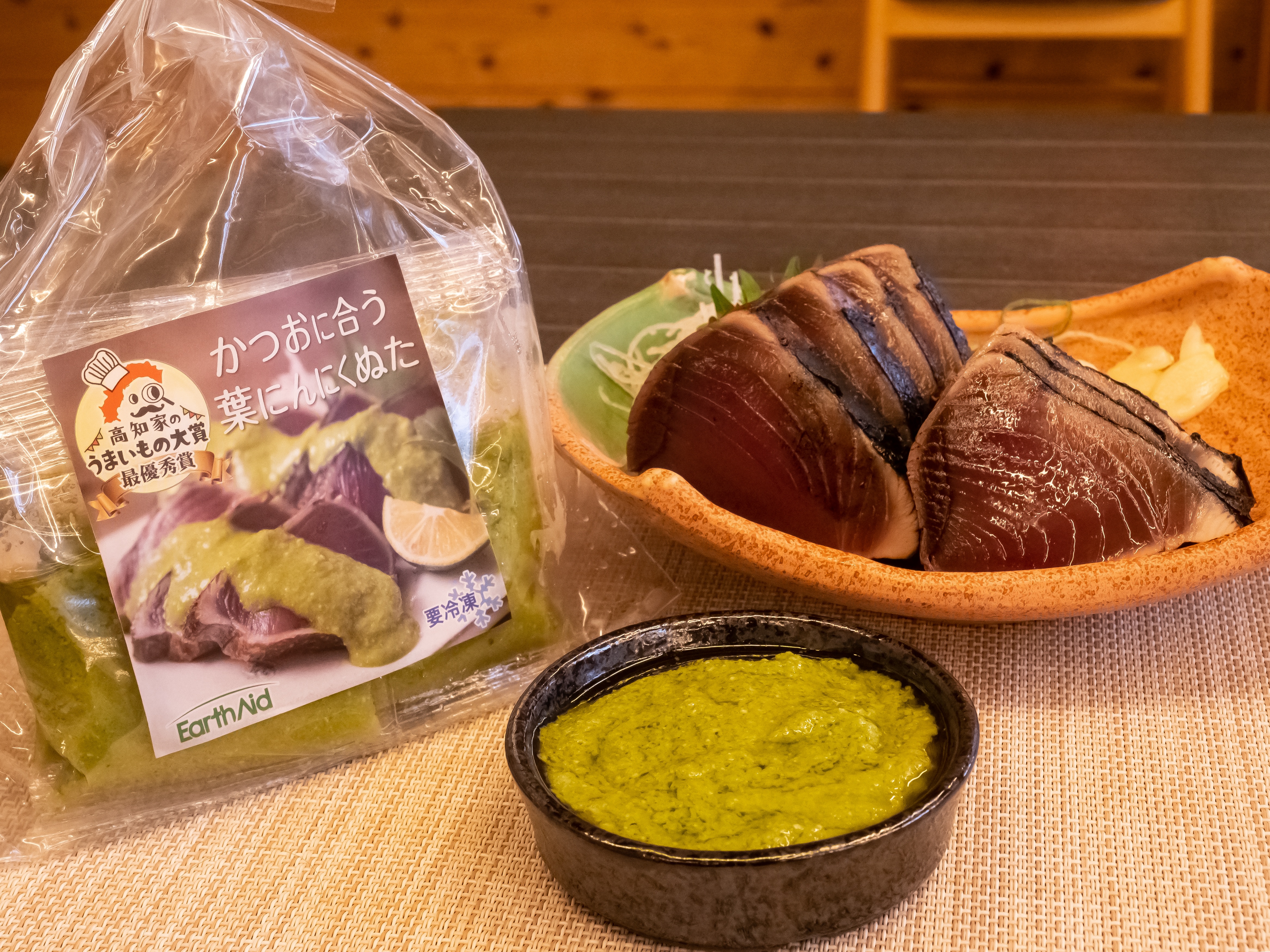 国内屈指のイタリアンの巨匠として知られる奥田政行シェフから「ジェノベーゼソースにポン酢を合わせたら、魚や肉と相性抜群の調味料ができるのでは?」という助言を受け、全国各地のポン酢を取り寄せて試したり、ニンニクの量や味を整えるカシューナッツ選びなど改良を繰り返すこと約1年半、「カツオに合う葉にんにくぬた」が完成しました。